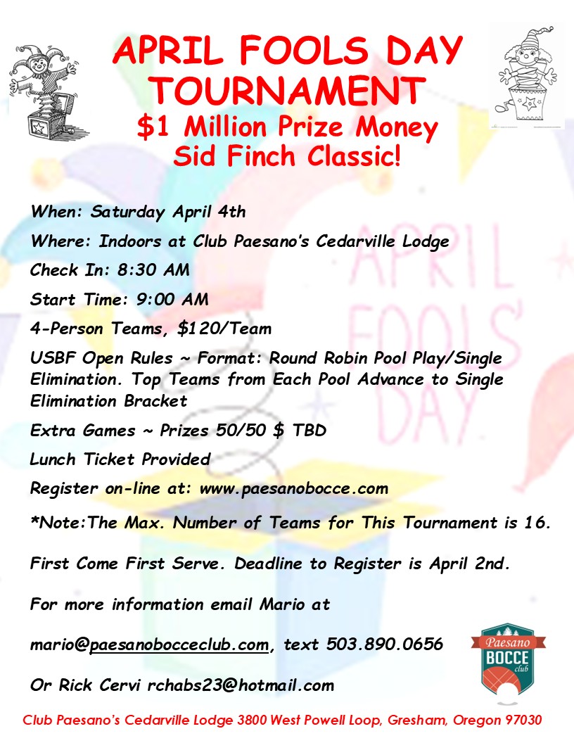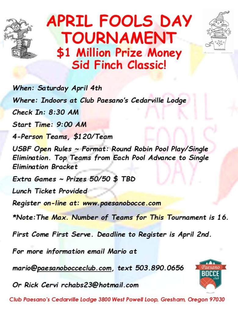 Click here to register: https://paesanobocce.com/product/april-fools-day-tournament-1-million-sid-finch-classic/