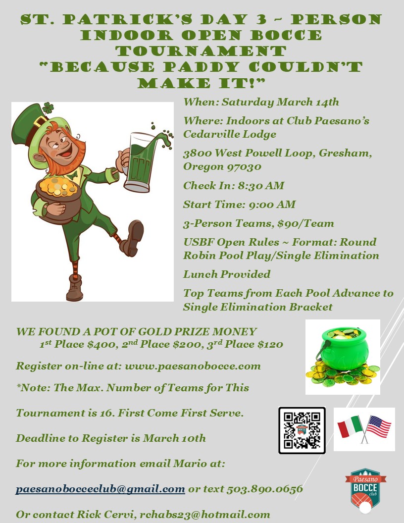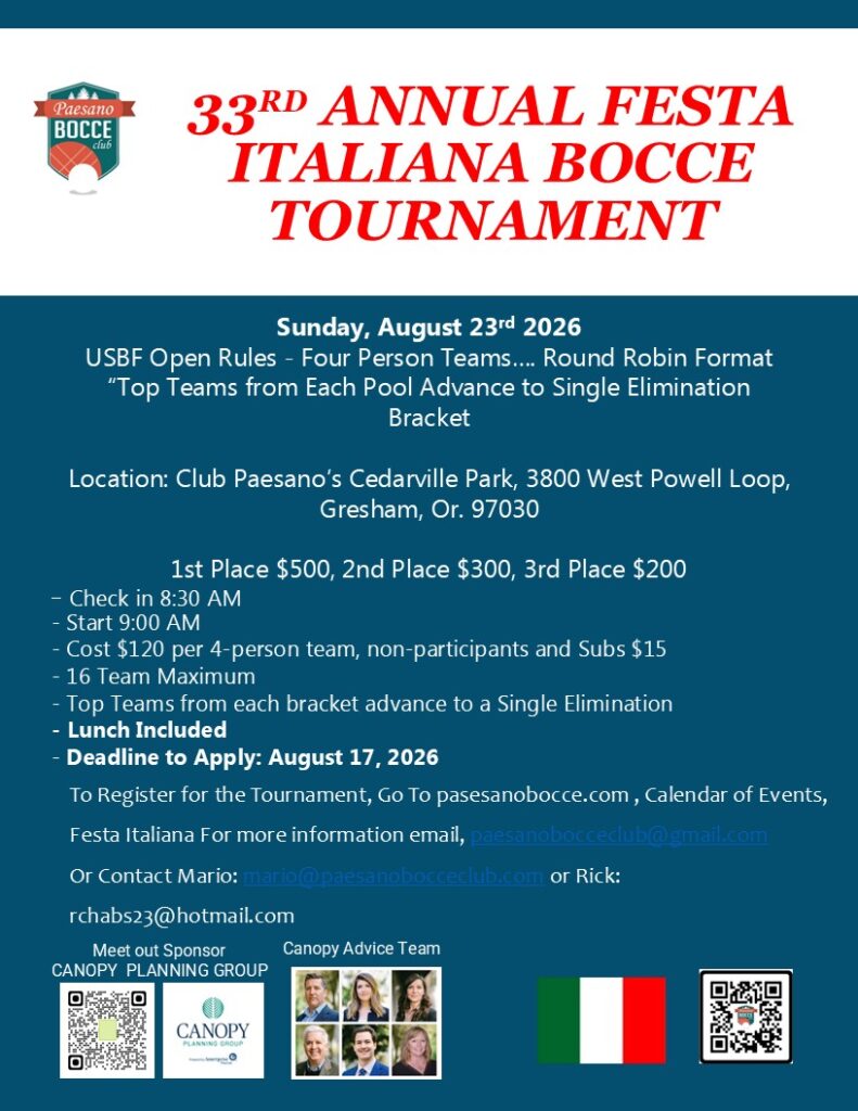 🏆 Paesano Bocce Club – 2026 Tournament Schedule
